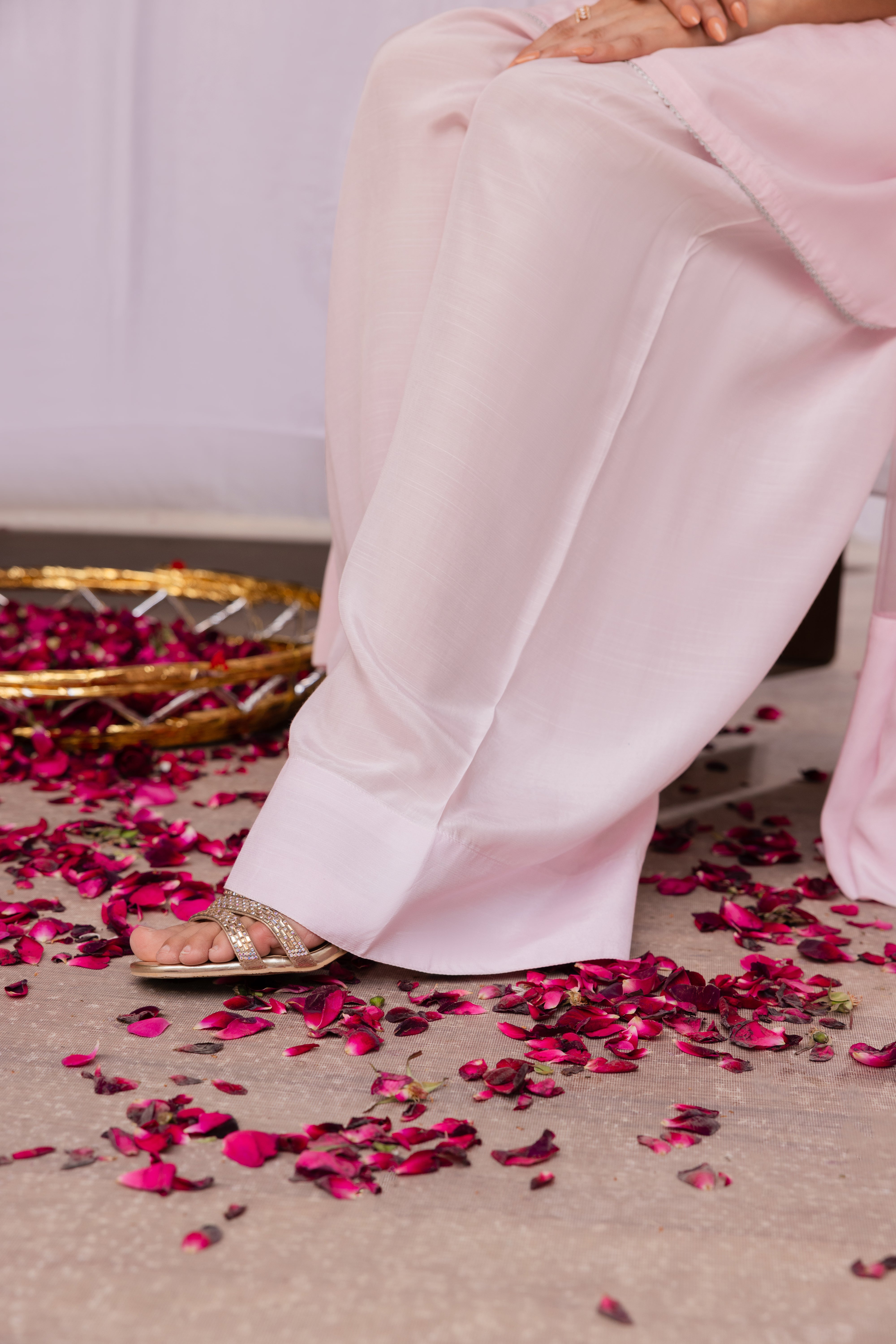 This stunning pink outfit features our signature cut with a short shirt, beautifully made with a slight v cut neckline and fabric buttons. It’s comes with a farshi shalwar, Inner slip and an organza dupatta, finished off with a raw silk border on two sides.