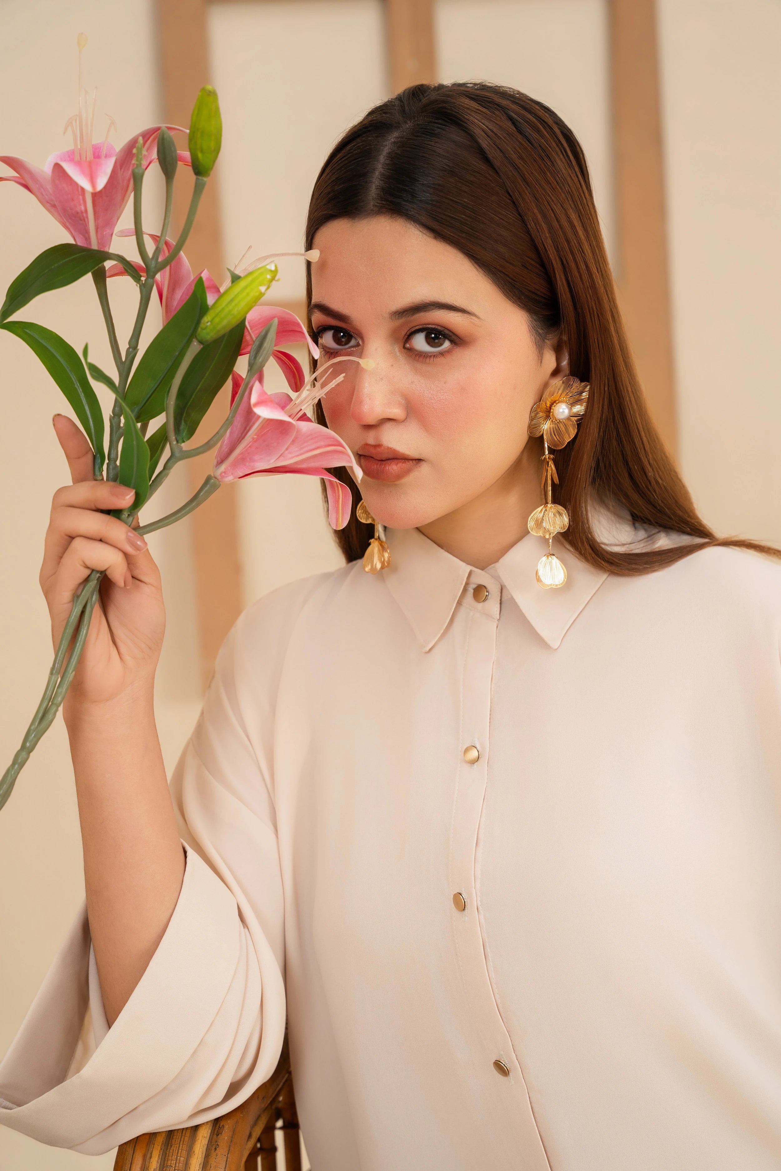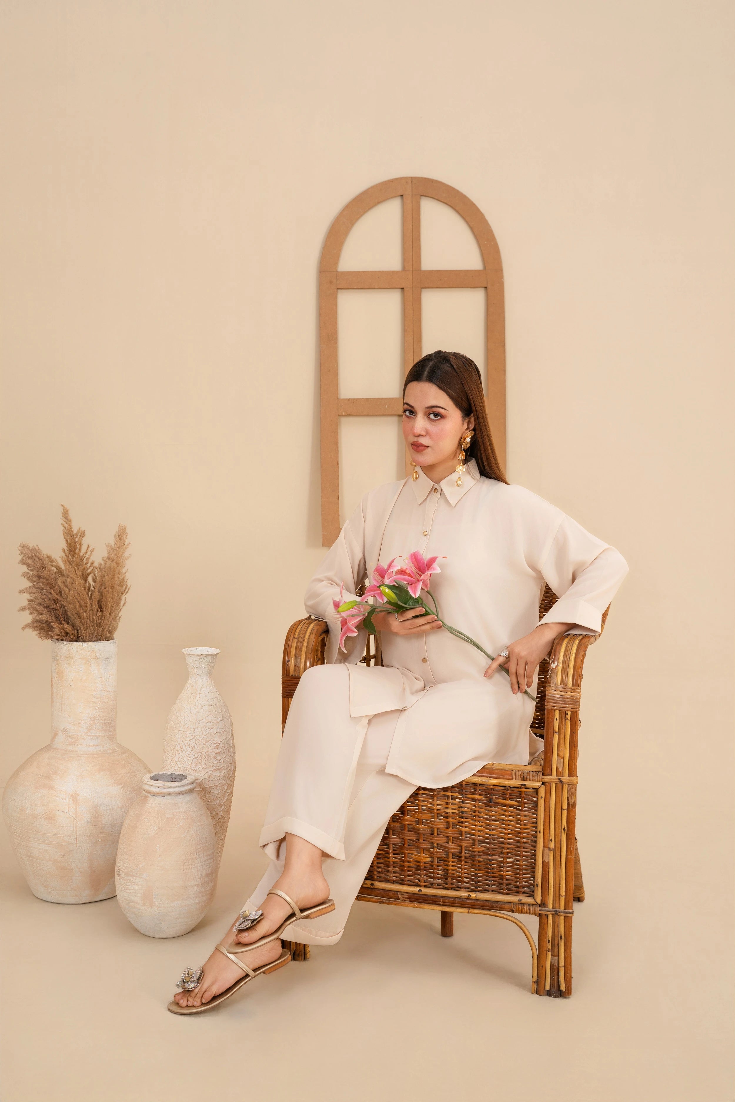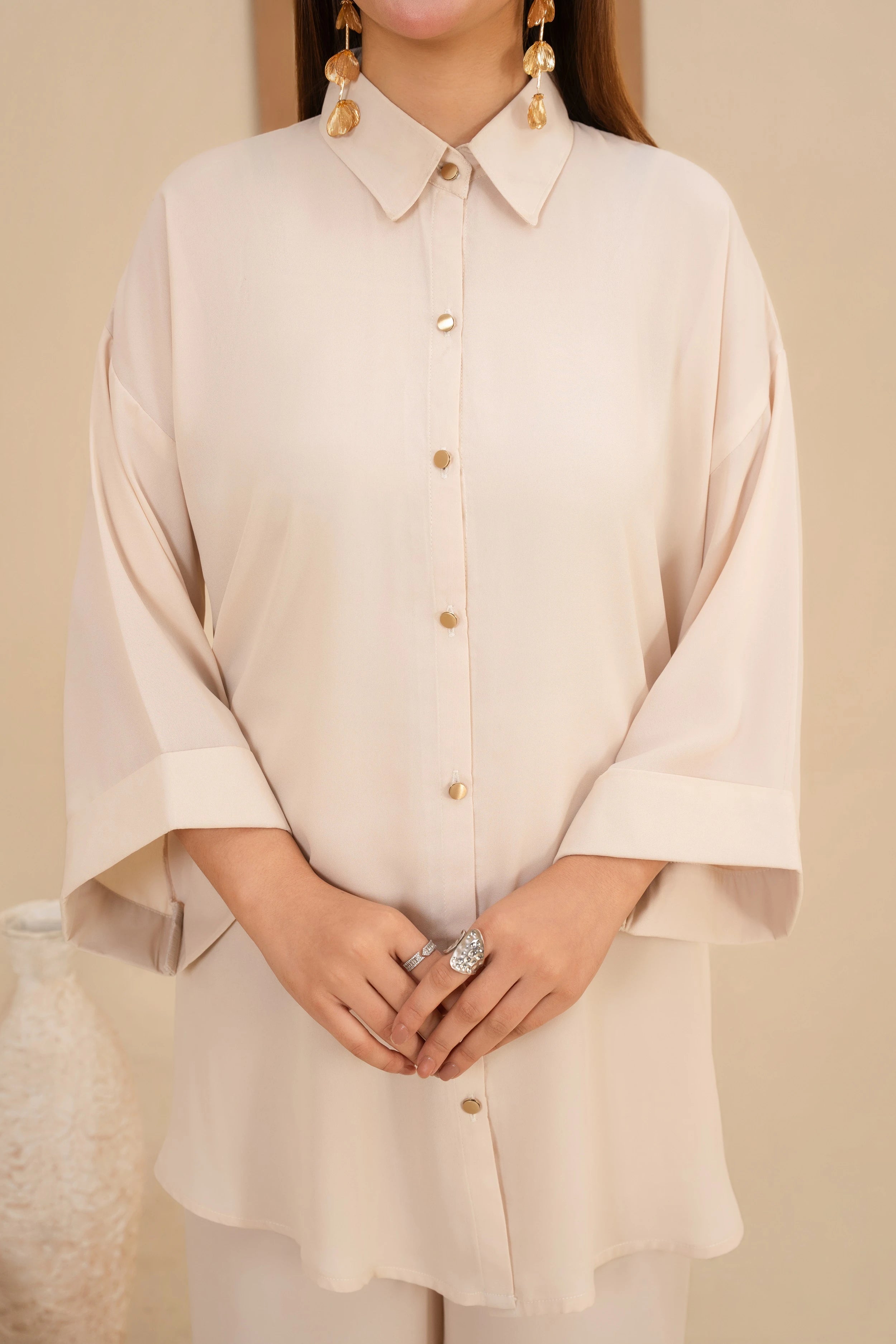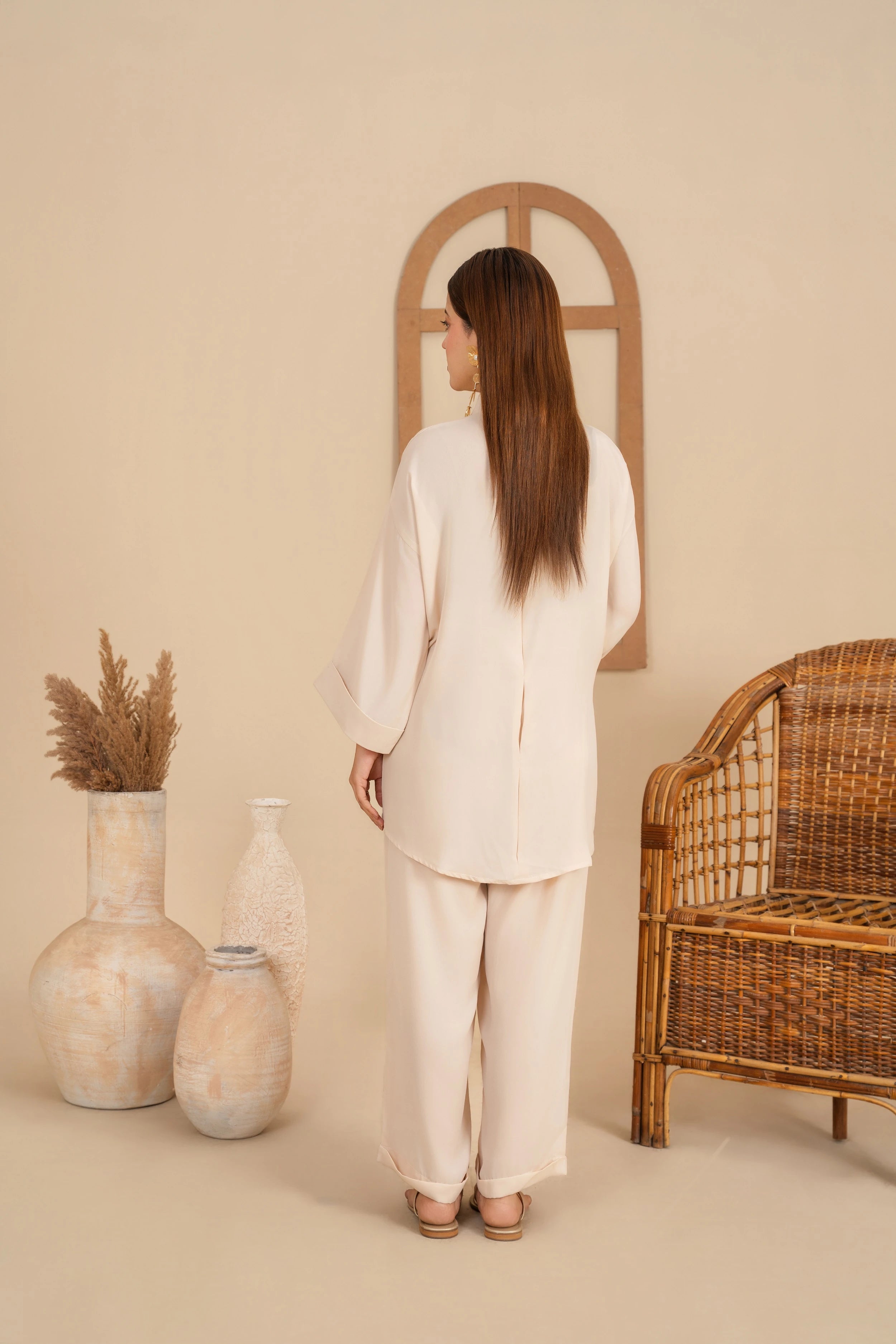 An elegant off-white co-ord set designed with a relaxed, modern silhouette. The button-down shirt features a classic collar, dropped shoulders, and wide sleeves finished with broad folded cuffs, accented by matte-finish golden buttons for a subtle statement. A center box pleat at the back enhances the fluid drape, while the clean curved hem keeps the look refined. Paired with matching wide-leg trousers detailed with folded hems, this lightweight georgette ensemble offers effortless sophistication with breathable comfort.