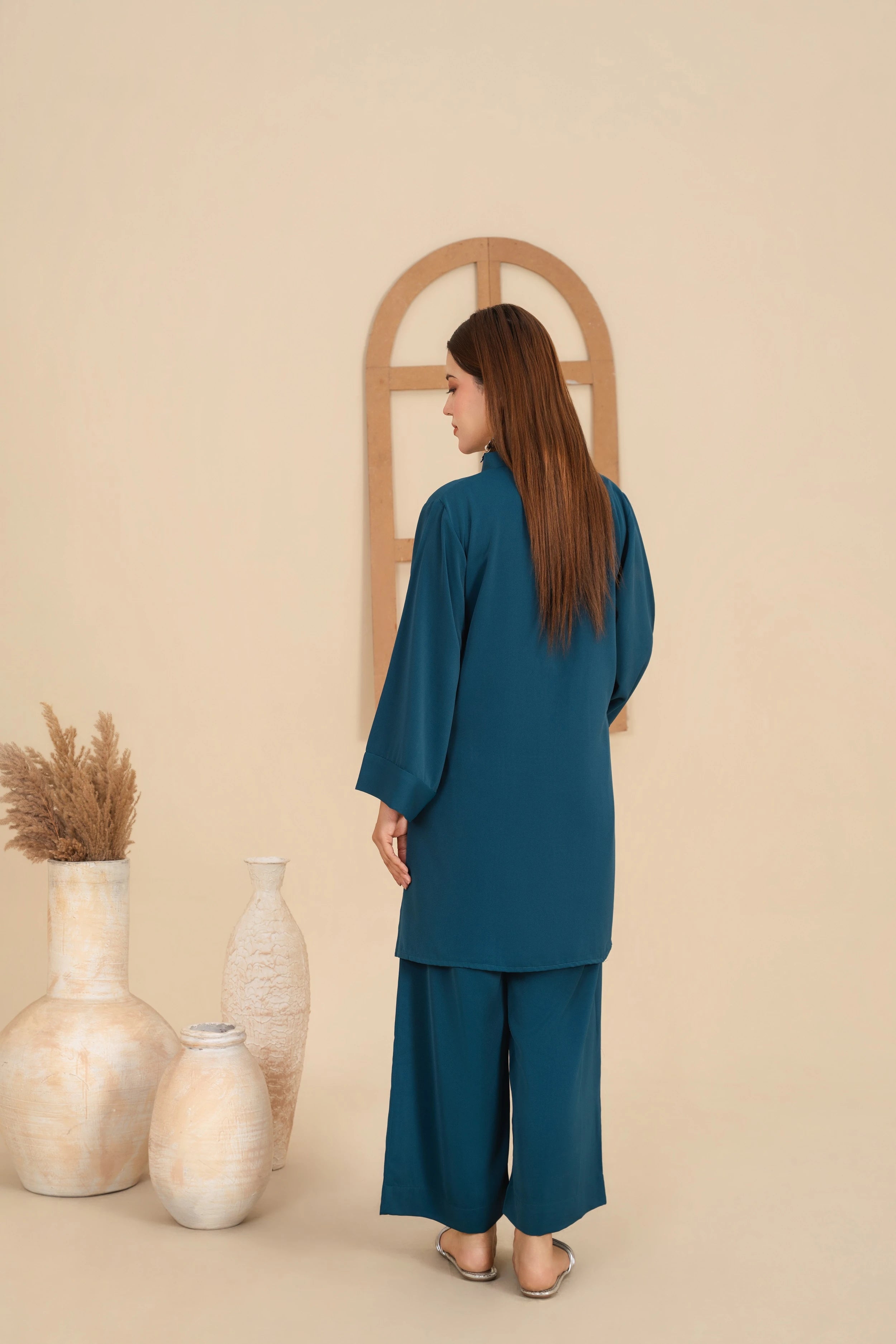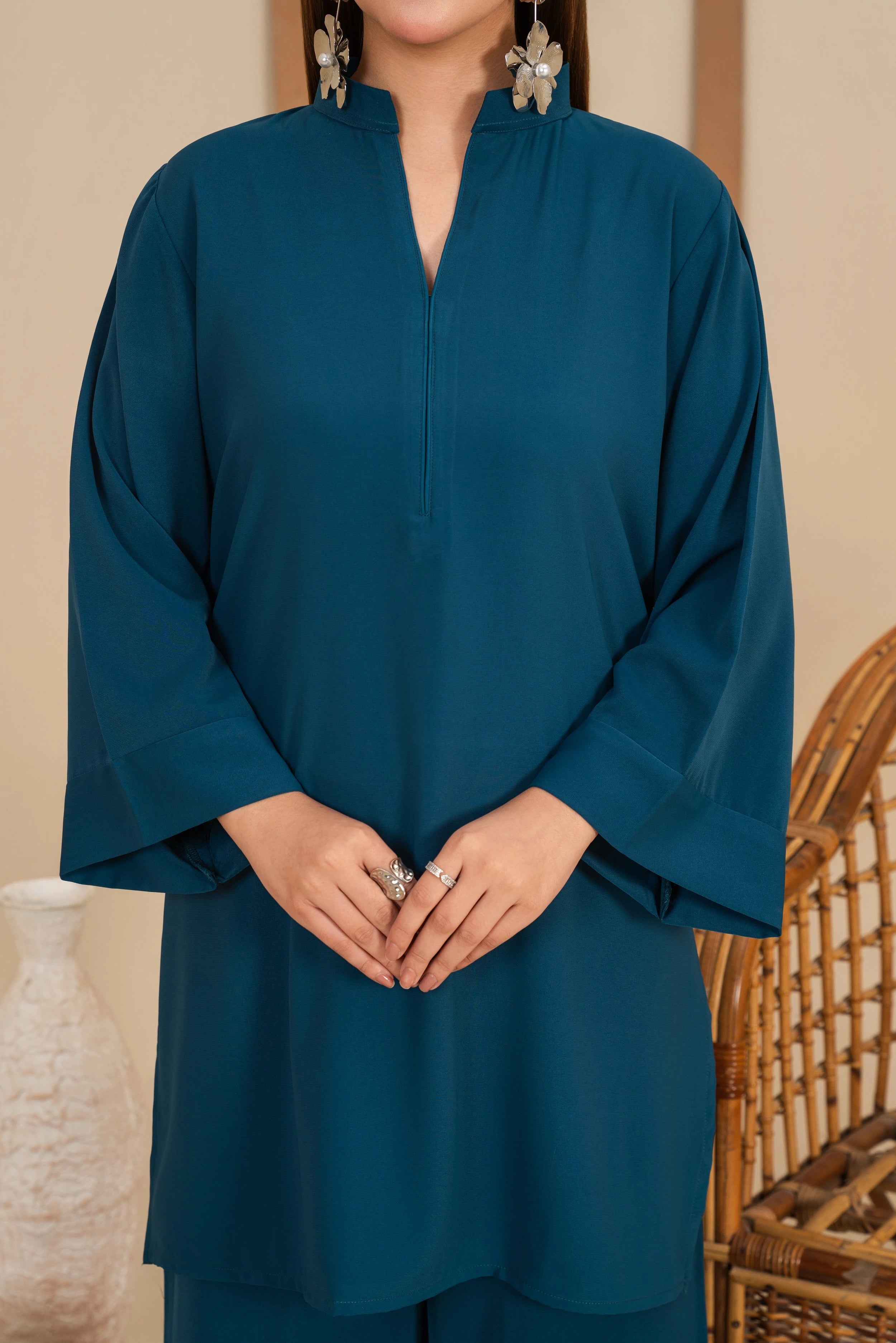 A sleek monochromatic co-ord in rich teal blue, designed with clean lines and a refined Western-inspired silhouette. The relaxed-fit tunic features a straight, even hemline with a neat mandarin collar and a subtle V-slit neckline for a polished, elongated look. Soft, wide sleeves fall naturally with a minimal finish, keeping the design effortless and understated. Paired with classic wide-leg culottes with a clean hem, this ensemble embodies modern elegance with timeless simplicity.